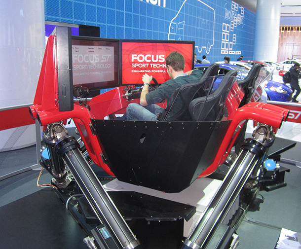 Ford is a pretty big company. Like, massive. It’s no surprise then that the game they brought with them to NAIAS was equally massive. The Focus ST driving simulator is a huge motion rig that thumps, bumps, turns, twists, and rattles as the user drives the virtual Focus on a track. The rig was a little difficult to get into, and seating three people meant that the two on either side of the driver had a bit of climbing to do. Using it was fairly fun, though, as the motion added a lot to the experience of driving. It should be noted that the amount of motion in the rig goes way beyond what actually happens on a track, and the speed doesn’t quite match the results on screen.