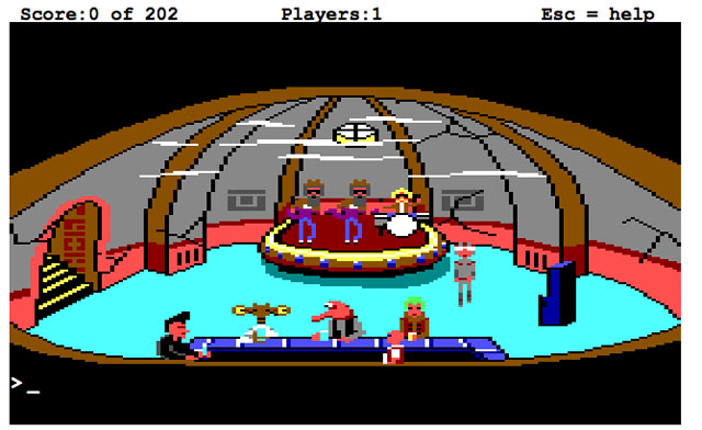 “>Look computer.” That simple command is what started an obsession. Having used the keyboard to walk Wilco into an archive room, I typed that in while standing in front of the dark screen on the wall. As the process began, and I was able to access information and solve that initial puzzle, the genre’s mechanics quickly spread like a virus throughout my body, and I knew to “look” at things and “push” buttons. Eventually, I would “give money” to vendors to buy ships, avoid giant sand-dwelling monsters, and even interrogate bar patrons, getting drunk in the process — inverting the controls on an Adventure game made for many an awkward situation.