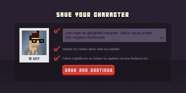 Website eightbit.me takes avatar creation back to the Sierra days with an online character customizer for Twitter. With the ability to change the color of a few blocks for hair, clothing and, and background a blocky caricature is made, ready to be inserted into Twitter profiles everywhere. Since Twitter is kind of an adventure game in and of itself, it works out well.