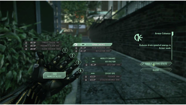 The nano suit and weapon upgrade menus were very elegant and easy to access. Press and press-hold start, to bring up the suit and weapon upgrade systems, respectively. The suit had four upgrade paths, each with three attributes – only one of those three attributes can be activated at a time. You unlock suit upgrades with alien DNA, that gets picked up from dead aliens. I only had to walk over the DNA to pick it up, rather than doing that annoying walk over and press ‘a’ to dance. That made me very happy. Suit and weapon upgrades can be switched out to harmonize with the shifting combat situations or players style.