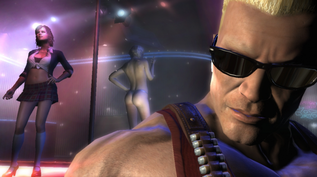 You submitted your Duke Nukem Forever questions, so here they are. Answered by Gearbox’s CEO Randy Pitchford, at an event with pole dancers, beer, DNF multiplayer kiosks and boobs (I had a blast BTW). Pitchford, the man that once argued that the Duke isn’t sexist because the Duke uses everything in his world as a plaything. This guy is as practised with his answers as a politician during election time, but his passion for the big fella was as hard to miss as the neon “Titty City” sign that graced the pole dancers stage.