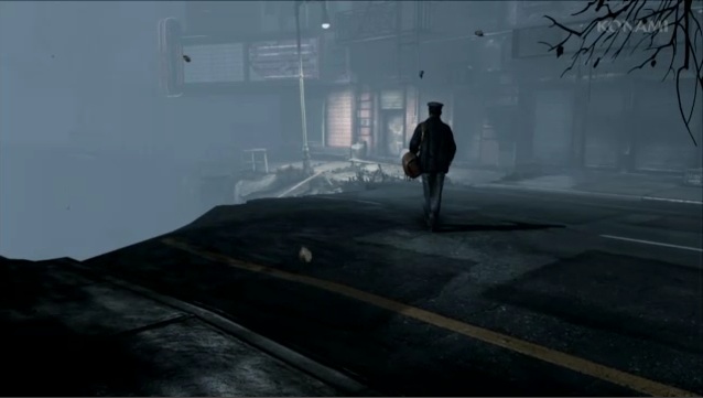 Silent Hill: Downpour is the first of the big titles showcased in the conference. Focusing on convict Murphy Pendleton, the story kicks off during a prisoner transfer where the prison bus runs off the road due to a giant hole in the pavement and ground. The bus rolls over the side of a cliff, landing the survivors in Silent Hill. There’s a shot of Pendleton and a cop walking into the town while the cop remarks, “‘Fraid all the roads are out; every last one,” in a very calm manner.