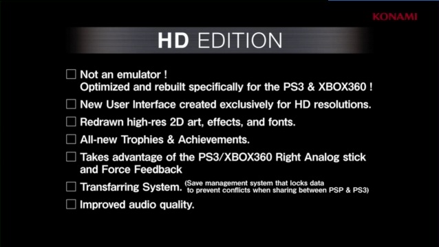 Metal Gear Solid: Peace Walker will be included in the Metal Gear Solid HD Collection, which will also feature HD versions of Metal Gear Solid 2: Sons of Liberty and Metal Gear Solid 3: Snake Eater. Kojima Productions is also working on a Zone of the Enders HD Collection, including HD versions of Zone of the Enders and Zone of the Enders 2: The Second Runner. These HD collections will be totally remastered games, not uprezzed versions running on an emulator.