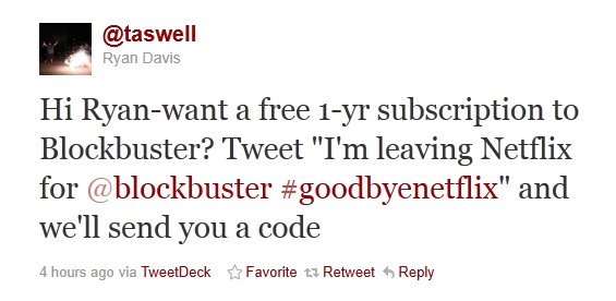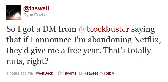 As tweeted by the reliably stalwart Ryan Davis of GiantBomb.com, @taswell on Twitter, Blockbuster contacted him with a deal whereby if he announced that he was leaving Netflix in favor of Blockbuster Total Access, their own DVD-by-mail selection program, that they would stipend him with a free 1-year subscription to said service. Ryan Davis immediately tweeted the offer, in its actual wording, which appears to have been sent to him via a direct message from Blockbuster’s main Twitter account.