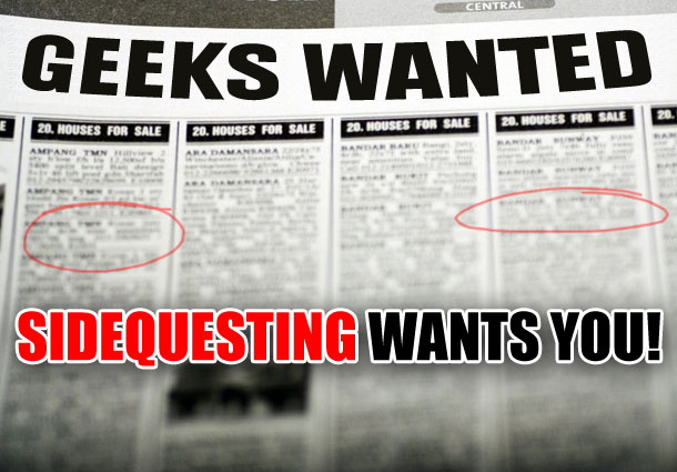 That banner reads true: SideQuesting is looking for more writers! Well, we’re always looking for writers, but since we’ve relaunched the site it’s high time that we fill in some of the spots that are open.
