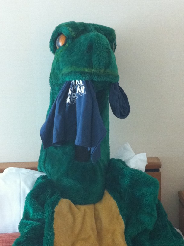 Back at the hotel I fully tried on the costume with the appropriate clothing. Dread was starting to set in as I realized that this monster suit I donned was indeed a monster in itself. The feet were easily 3 times the size of my own foot, and all of the dance moves I had been practicing were going to be nearly impossible. And that was before I tried on the dino-feet. But I was still excited.