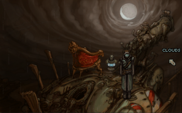 Primordia’s dystopian world shows promise. There’s a distinct look to the way it combines the rusty browns of metal and the worn pieces of junk. Moments where you stumble upon remnants of familiar objects, like tanks and human skeletons, the tinge of sci-fi mystery keeps you asking questions you’ll want to answer.