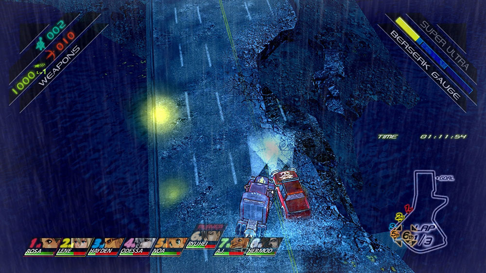 Overdose’s story is bonkers. Set in a post-apocalyptic future, racing tournaments decide who receives supplies. Each of the game’s playable characters bring with them their own reason to enter the races, interacting with the other characters along the way. The mini-plots are reminiscent of how fighting games often follow the narrative of whoever the player selects to move ahead with. Along the way friends will sabotage my cars, enemies will fall in love with me, and family connections are made, broken, and made again. In fact, it’s worth playing through the plots of a few of the characters just to see how off-the-wall they can get, each seeming to top the previous.