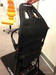 Walking up to the Playseat stand, the first thing on display is their new Challenger seat. The chair, which lets you fold it up and stow it into a corner or a closet, is made of a simple tubular frame and suspension materials. That may not seem plush, but the seating angle designed by the Playseat team and baked into the Challenger makes for a surprisingly comfortable seating position. It’s a combination of a slouch position and a racing seat, with the cushion kicked up at a nice angle and the steering wheel mount in a great location — no, you don’t have to keep a steering wheel mounted. The platform can be popped right off. The seat is adjustable all around with velcro straps loosening or tightening the lumbar and the armrests.