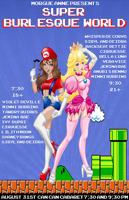 From the minds that brought you Tails from the Crypt and Starving Artists on Parade comes an all new adventure through the vast world of video games. Super Burlesque World brings together a collection of some of Seattle’s best performers: for two back to back performances on August 31st before it disappears forever (or at least until next year!). Join host Morgue Anne as M4R10 on an exploration beyond the borders of the Mushroom Kingdom and into a wild assortment of video game universes in her journey to rescue the princess. This strip-tacular celebration of gaming culture takes place at the historic Can Can cabaret in Pike Place Market one night only, 7:30 and 9:30pm. Grab your tickets while you can, this is one side quest you don’t want to miss!
