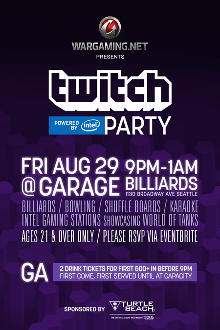 - Wargaming Presents: Twitch PAX Party, Powered by Intel – 9PM-1AM – Garage Billiards, 1130 Broadway, Seattle, WA 98122 – Tix: Free (Eventbrite)