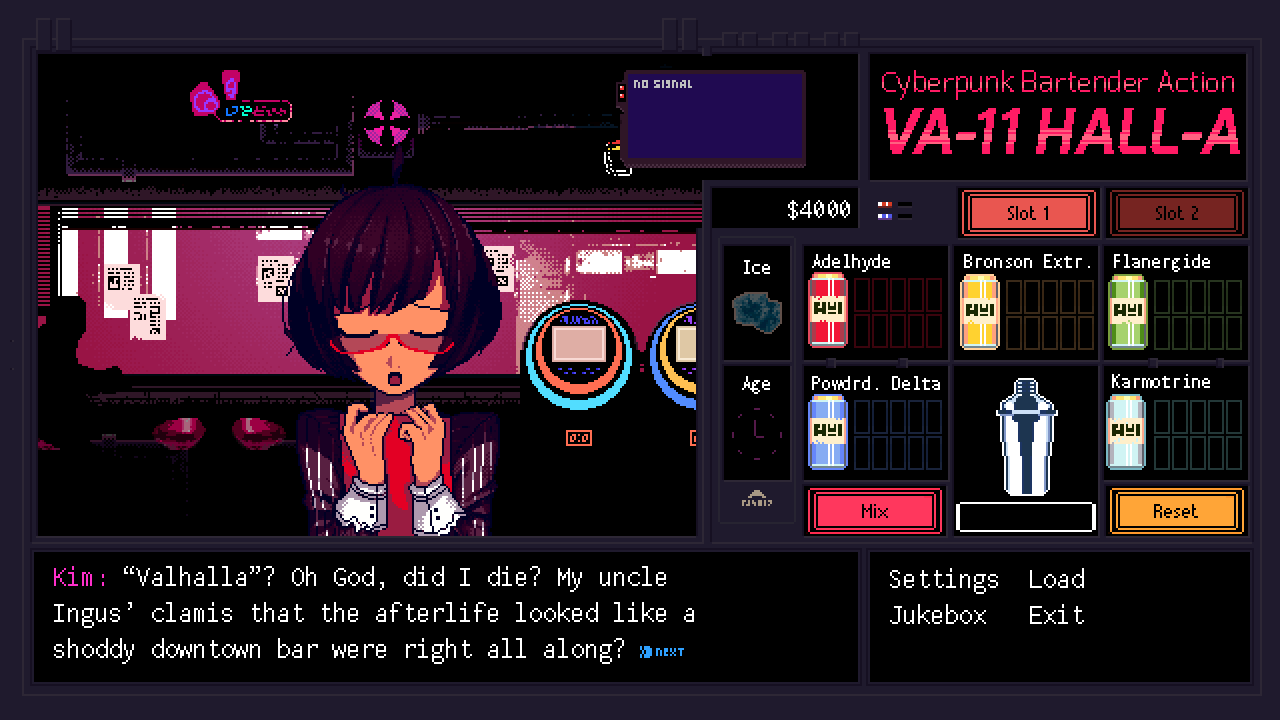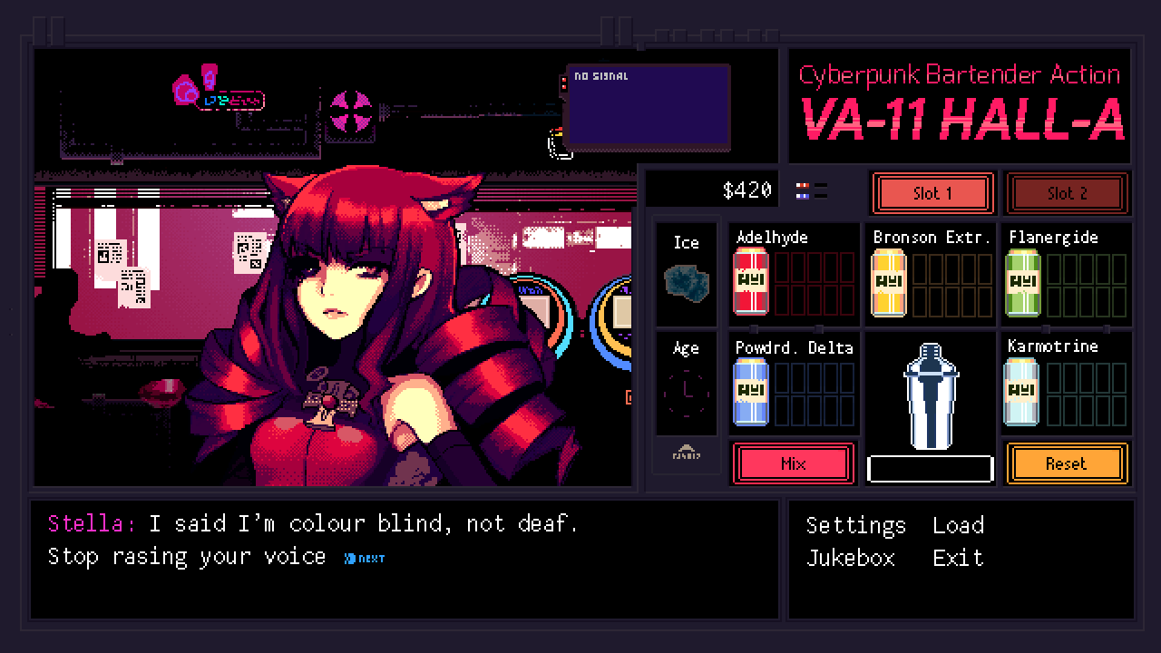 Equal parts visual novel and bartender simulator, Sukeban Games’s depiction of a post-dystopian, cyberpunk bar is both smart and compelling. The premise is disarmingly simple: as the bartender Jill, players take orders from NPCs and prepare drinks according to instructions. Each time an order is placed, a menu pops up that organizes the futuristic booze by name, style, or flavor. Drinks may be shaken, served on the rocks, or aged.