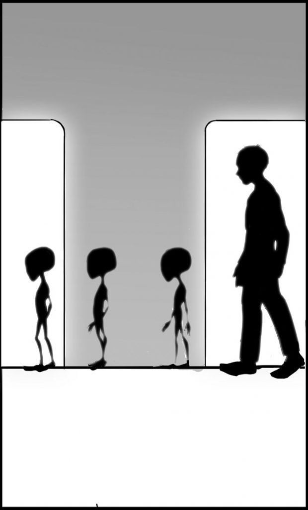 The method is much like that of a sketch artist pulling details out of interviewees, and so Shelby brought in Mindy Mcpeak to illustrate. As she creates panels and artwork, Mindy asks Rob to contact abductees about specific things. Do the aliens have feet? Do they wear shoes? Are there lights on the walls, and what color are those lights? It surprisingly doesn’t take a lot of effort to get the information out of abductees, as the memories tend to be vivid in their minds. In fact, every convention and expo the duo go to seems to result in visitors, abductees themselves, coming up to their booth to thank them for capturing the scenes so accurately. One adult man even cried when he saw it recently, since his own family didn’t believe his experience.