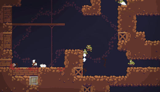 In Caveblazers you play as a dude who finds a random cave, and when you enter there’s an old man that tells you to “stay out!” This is where your adventure begins. The further you venture down into the cave the more things around you begin to look and feel different. Every two or three levels the aesthetic changes into something different than the last. For example the first two levels are just dirt and grass. Then the next area is all stone and feels sort of like a temple. In between different zones is a random boss that is actually very well thought out and realized, and a huge highlight of the game. All of the areas are destructible and have monsters crawling through them, and the AI is so relentless in their attacks that you’ll have no place to hide. Scattered throughout the labyrinth of monsters and platforms are random pick ups of weapons, blessings, potions, bows, rings, etc. Each of these items have different stats and will either encumber you more or help you more. It’s all so randomly generated that sometimes your runs through the cave will end on the first level and sometimes they’re so good you can get pretty far down into the spooky depths. Though it’s randomized it all makes perfect sense, and it doesn’t make the game’s moment to moment gameplay feel lackluster.