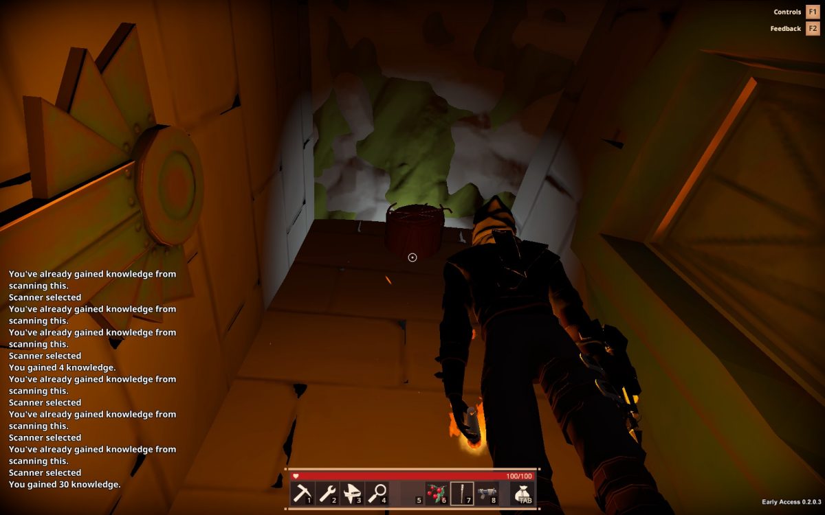 Here’s what’s there so far: you design a character on a server, and it spawns you on a small island floating in the sky. The ‘tutorial’ tasks you with accruing enough Knowledge to learn a skill in the tech tree called ‘Shipbuilding’, by equipping a scanning tool and walking around your island scanning things until you can afford it. Once learned, you then harvest wood from trees and minerals from rocks to build a rudimentary airship to escape the island, flying to another island to start the scanning process over.