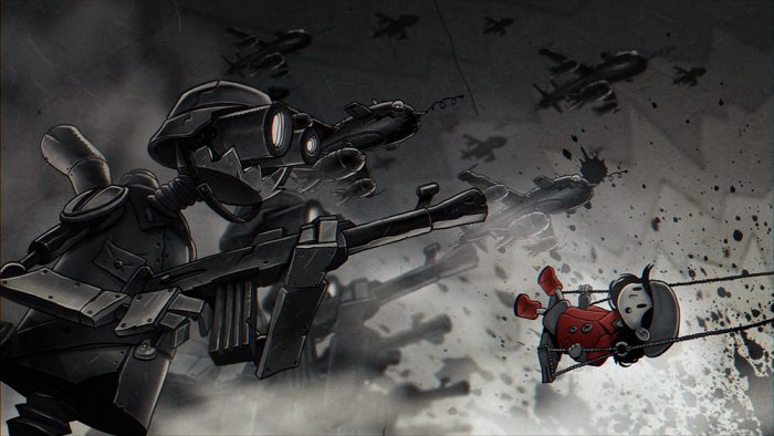 There is no violence in my playthrough, either. All of the actions are undertaken by kids, so while they may throw something they do so to get someone’s attention, not to hurt them. There are no overt symbols, but plenty of symbolism. From the machine-like soldiers of war, to the giant blimps and steampunk trains, we’re clearly in a fear-inducing time. The only colors that appear in the game are splashes of red, indicating both danger and also action.