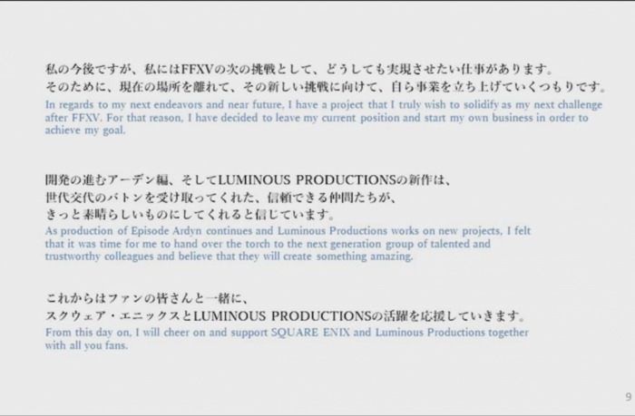 Therefore, I decided to take this opportunity to officially announce my departure from Final Fantasy XV to all the fans who have supported the title across the globe.