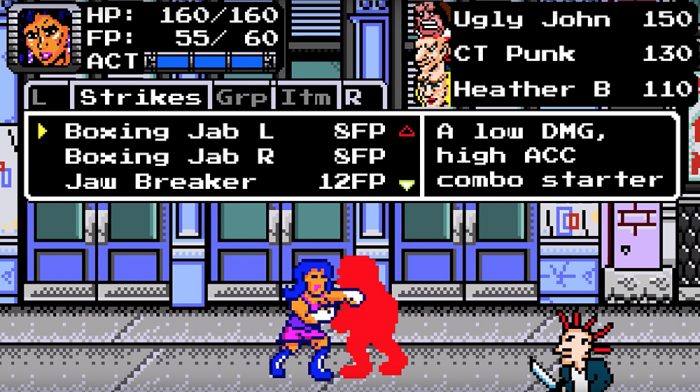 This makes battles much more tense and methodical than traditional 2D brawlers. My tactic? Try to run away to recharge my FP, but this leaves me vulnerable to back attacks that send us into a defensive mode in which we can try to block or counter. Taking down the demo’s boss is satisfying as hell, I need to admit. The strategy of going after him and pulling back, then going after him again is decent, but with so many of his minions on the screen we need to be resourceful with our FP and who we’re going after. Answer: the bikers. They have a tendency to knock us down just as we’re about to go after the boss, so taking them out first is key.