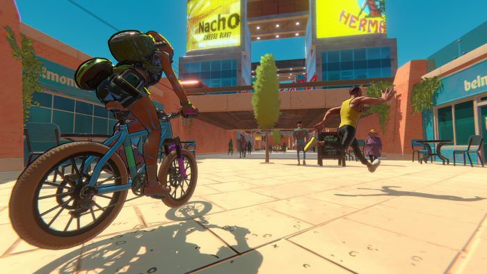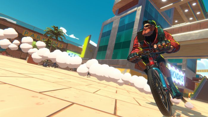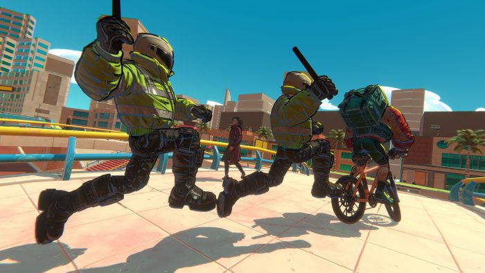 Parcel Corps takes place in a world where biking is outlawed, so of course we’re biking. We’re part of a trio of bikers in competition with two other groups, and we need to deliver packages around a city as fast and best as we can. It’s very bright and colorful, like Jet Set and Crazy Taxi, and pops off of the screen. And like those games it has meet customers and move around a town, avoiding precarious situations and the authorities.