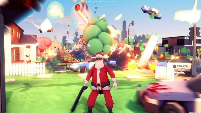 My biggest gripe is that driving the car sucks because it’s the type of controls where we have to push the stick forward to go forward. But because it has the overhead view, sometimes we’re not pointed in a direction where that feels natural, and we are still moving forward with various degrees of left and right. It’s an awkward way to drive the car. Part of me feels like it’s a gameplay mechanic that didn’t come together perfectly great, but also kind of intentionally chaotic at the same time. The gun/car combo does do a very good job at just taking down who’s directly in front of us, so once we’re in the car and we’ve got the gun firing we can run people over until the vehicle is no longer functioning, after which we get out and find a fresh ride.