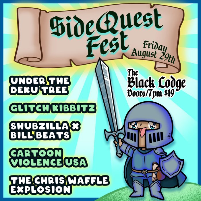 - Info: SideQuest Fest ft. incredible performances by Under the Deku Tree, Glitch Kibbitz, Shubzilla x Bill Beats, Cartoon Violence USA, The Chris Waffle Explosion