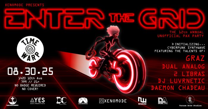 - Info: Facebook | Lisa Weeks here, CEO of XenoMode, excited to bring you the 12th Annual “Enter The Grid” Unofficial PAX Party! We’ve been hosting our Tron-themed party since 2013, and this is the second time we’ve held it in an actual arcade, and we are thrilled to return to Time Warp as our very own “Flynn’s Arcade” for the occasion!