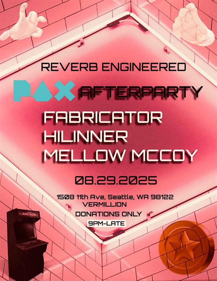 - Info: Come join us for a night of post gaming fun and music at Vermillion Art Gallery and Bar! Whether you’re winding down after a day at PAX or just looking for a good time, this event is the place to be. Get ready for live performances by Fabricator (@fabricator.seattle), Hilinner (@hilinnermusic), and Mellow McCoy (@mellowmccoy) and a chance to mingle with fellow gamers. Don’t miss out on the opportunity to celebrate gaming culture in style. See you there! Additional Info: You can order or bring food in, we’ll have some drink specials.