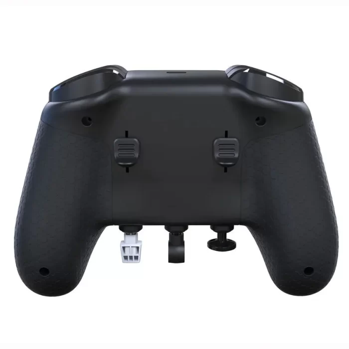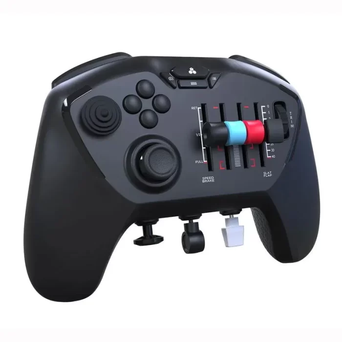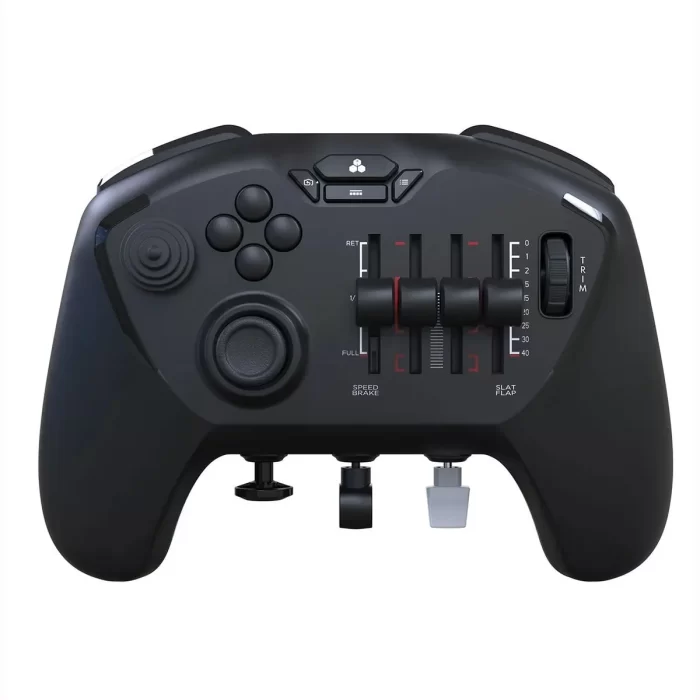 At first glance the controller might seem like a high end game pad, but the similarities stop there fast. While it’s the same profile as our modern gamepads instead of a right thumb stick we have four sliding toggles. We don’t have extra macro buttons on the back, instead we have sliding rudder controls. And we also have interchangeable bits that we can add onto the controller. The entire device is incredibly complex, and yet it’s wildly convenient and accessible.